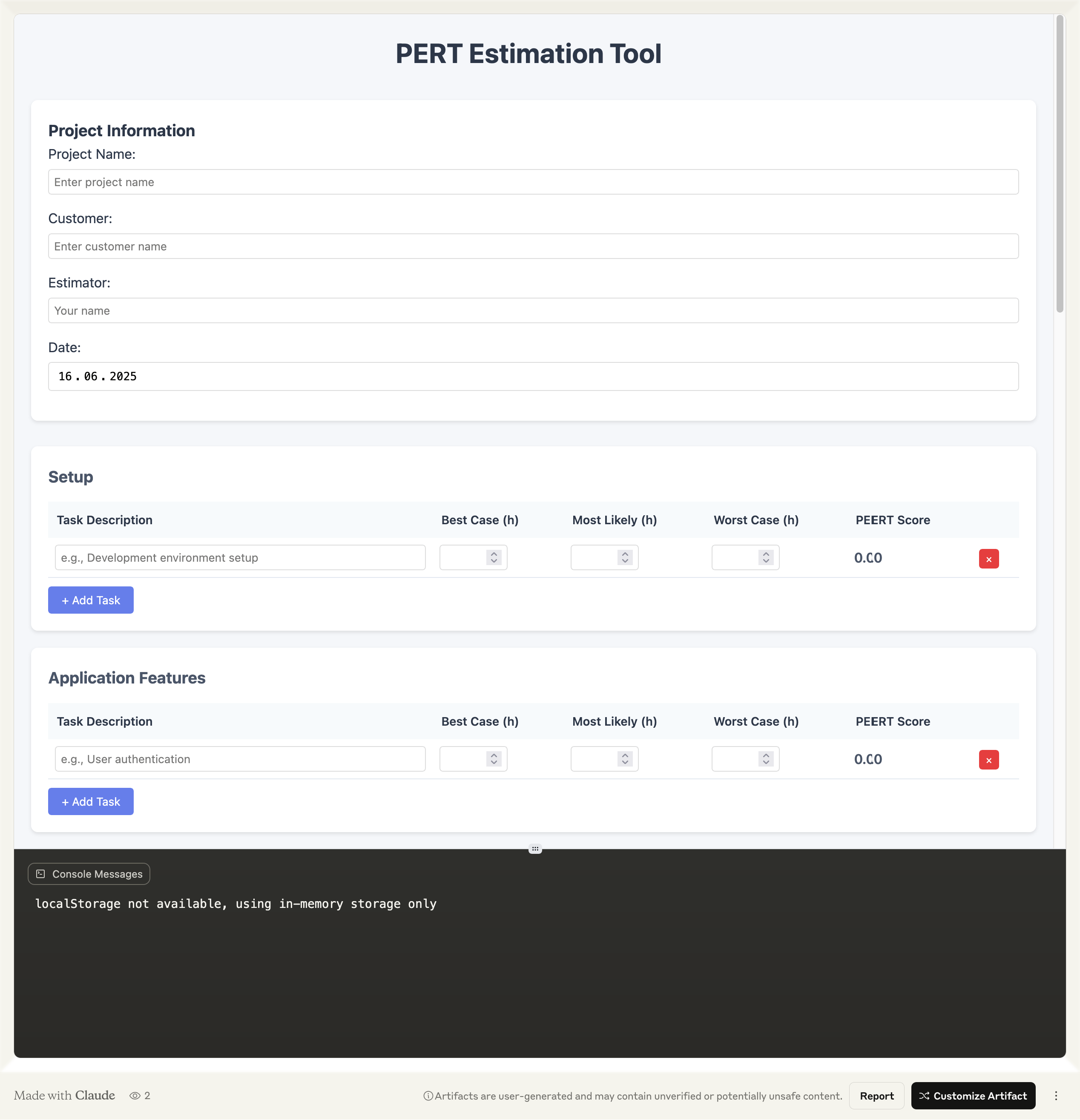 🐛 Unfortunately, the application throws a security error in the browser that has to do with accessing localStorage in the sandbox (Claude Artifacts). If you open the file locally or deliver it via a static web server, you should not get the error.